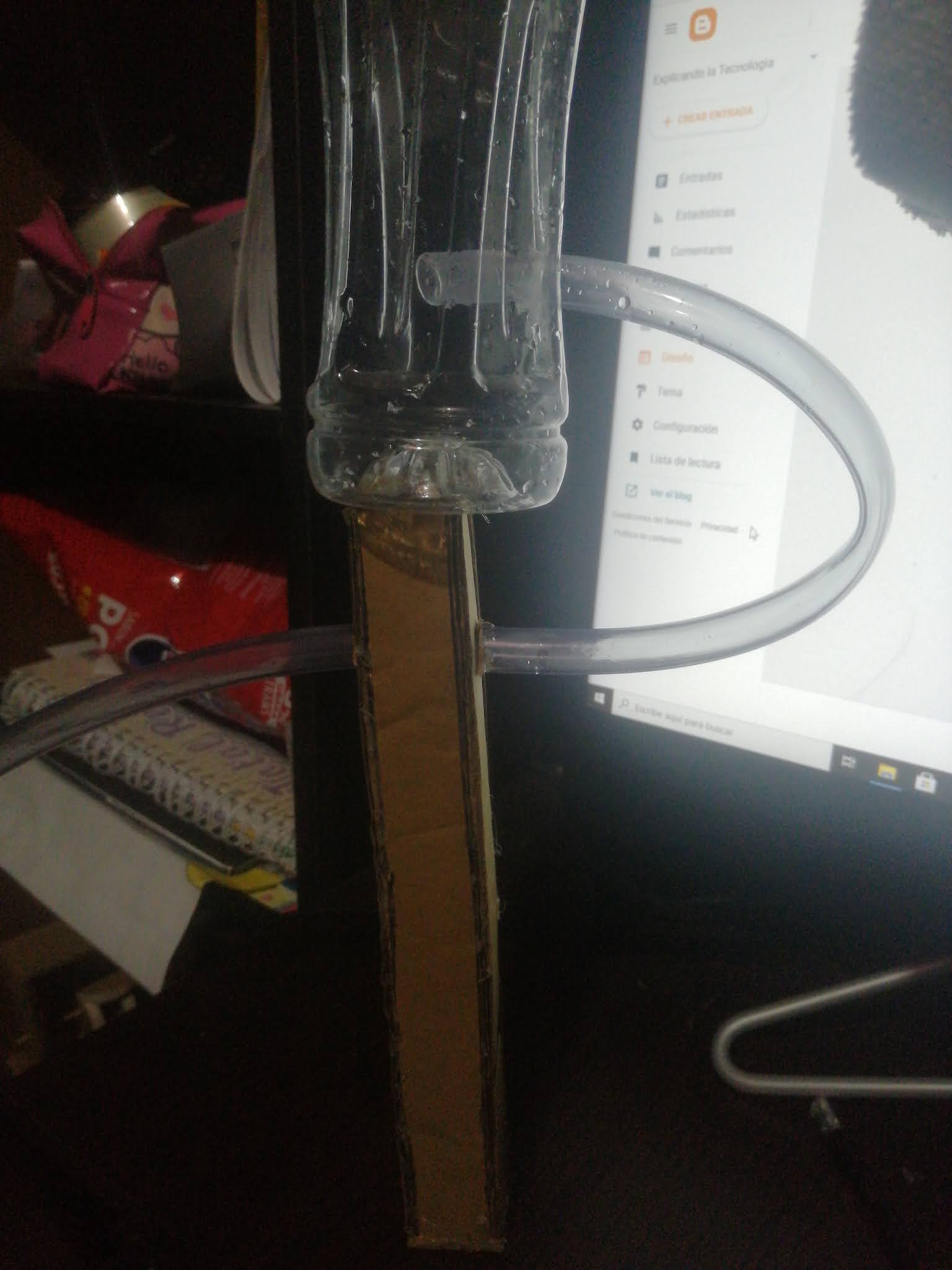 Cortamos la mitad de una botella la colocamos en la cima de la torre de cartón pasamos la manguera por medio de un agujero en la botella y la volvemos a pasar en lo último de la torre